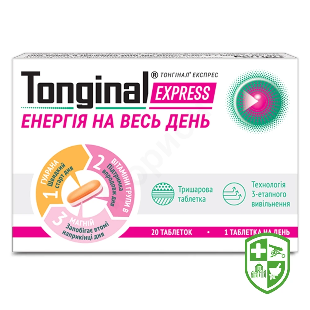 Тонгінал Експрес забезпечить енергією протягом дня. Таблетка Тонгінал Експрес тришарова та виконана за технологією 3-етапного поступового вивільнення.Перший шар — швидке вивільнення натурального екстракту гуарани допоможе розпочати день із заряду енергії. Натуральний рослинний екстракт гуарани підвищує рівень енергії вранці. Протягом багатьох століть гуарану використовували в Амазонії (Південна Америка) як природний підсилювач енергії.Другий шар з безперервним вивільненням вітамінів групи В у поєднанні із женьшенем і залізом підтримує енергію впродовж дня. Комплекс вітамінів групи В сприяє нормальному обміну речовин, що забезпечує належний рівень енергії, фізичної та розумової працездатності. Третій шар — повільне вивільнення магнію допоможе уникнути втоми до завершення дня. Магній допомагає знизити відчуття втоми і сприяє розумовій активності.