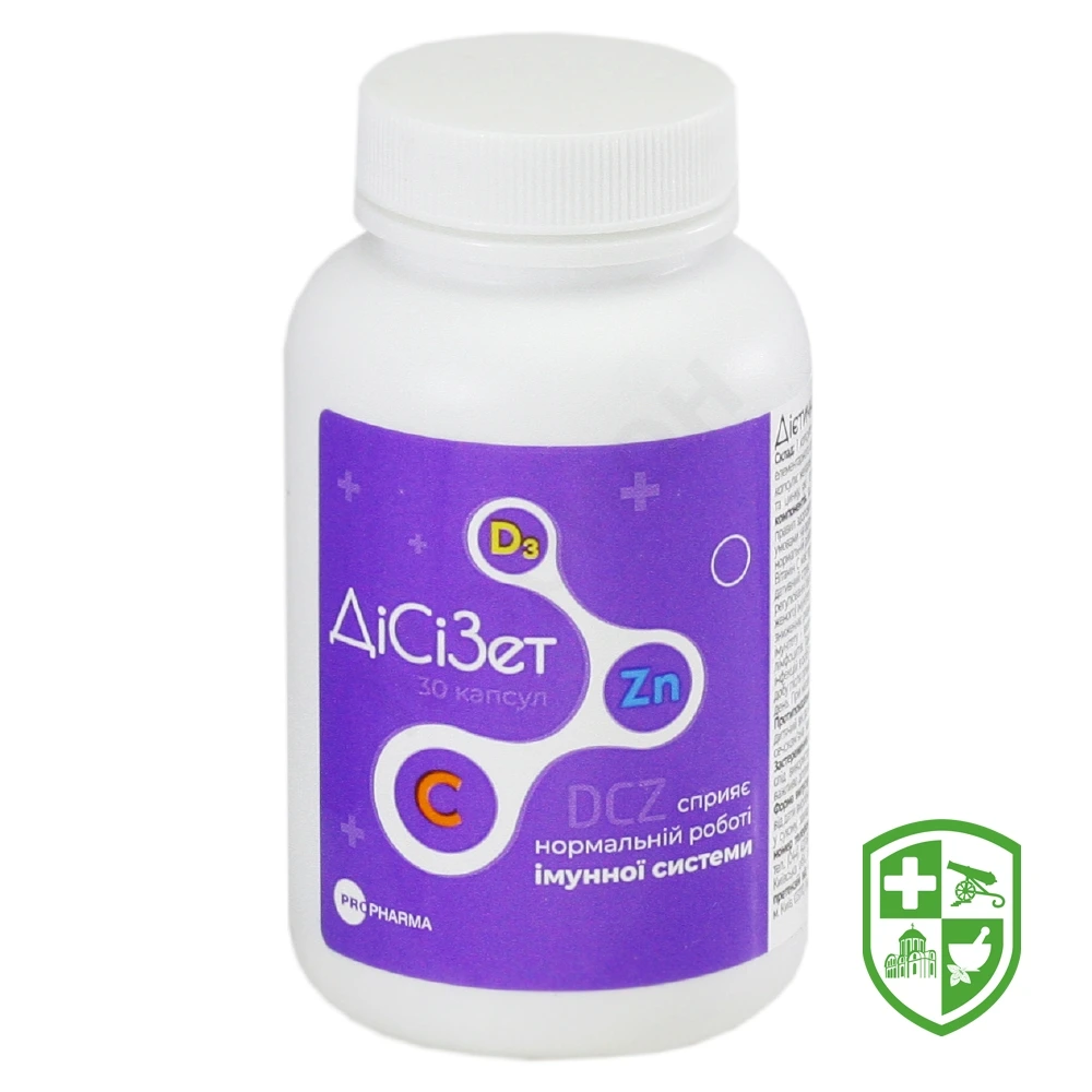 Дієтична добавка «ДіСіЗет»/капсули/аскорбінова кислота (вітамін С) — 1000 мг (mg), цинку оксид — 19 мг (mg), (що еквівалентно 15 мг (mg) елементарного цинку), вітамін D3 (холекальциферол) -1000 MO (IU) [25 мкг (pg)] / 30.