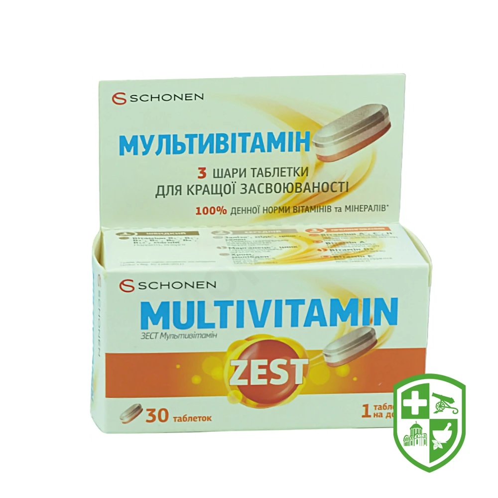 3 шари таблетки — роздільне вивільнення — краще засвоєння.Тришарова технологія Зест Мультивітамін забезпечує диференційоване вивільнення вітамінів та мінералів у три фази: – перша — швидке вивільнення, впродовж 5 хв — для водорозчинних вітамінів групи В та магнію;– друга — впродовж 45 хв — для мінералів;– третя — повільне вивільнення через 8 год — для водорозчинних вітамінів С, Н та жиророзчинних вітамінів.Запатентована технологія MULTI-LAYER компанії S.I.I.T S.r.l., що використовується у виробництві тришарових таблеток Зест Мультивітамін, розроблена спеціально, щоб забезпечити максимальну біодоступність та покращену засвоюваність компонентів завдяки дії впродовж цілого дня.Завдяки цій технології оптимізована взаємодія між вітамінами та мінералами для полегшення засвоєння. Це забезпечує максимальну біодоступність кожної складової.Зест Мультивітамін — це базовий вітамінно-мінеральний комплекс, який завдяки збалансованій формулі гарантує щоденне надходження вітамінів, мінералів та антиоксидантів з метою підтримки загального стану здоров’я організму впродовж доби. Особливості компонентів, що входять до складу Зест Мультивітамін Вітамін В5 (кислота пантотенова) сприяє фізіологічному енергетичному метаболізму, синтезу та метаболізму стероїдних гормонів, вітаміну D та деяких нейромедіаторів, зменшенню втомлюваності, бере участь у забезпеченні розумової діяльності. Вітамін РР (вітамін В3) сприяє підтримці природного енергетичного метаболізму, функціонуванню нервової системи, зменшенню втомлюваності, бере участь у підтримці нормального стану слизових оболонок та шкіри. Вітамін В1 сприяє фізіологічному перебігу енергетичного метаболізму, функціонуванню нервової системи, функції серця. Вітамін В2 сприяє нормальному перебігу енергетичного метаболізму, обміну заліза, захисту клітин від оксидативного стресу, підтримці фізіологічного стану слизових оболонок, еритроцитів, шкіри, зору, належному функціонуванню нервової системи, зменшенню втомлюваності. Вітамін В6 сприяє синтезу цистеїну, обміну гомоцистеїну, білка та глікогену; енергетичному метаболізму, зменшенню втомлюваності, утворенню червоних кров’яних тілець, фізіологічному функціонуванню нервової та імунної систем, бере участь у регуляції гормональної активності. Вітамін В9 (кислота фолієва) сприяє синтезу амінокислот, формуванню крові, обміну гомоцистеїну, відіграє роль у процесі поділу клітин, сприяє правильному функціонуванню нервової та імунної систем, зменшенню втомлюваності. Вітамін В12 сприяє фізіологічному енергетичному метаболізму, обміну гомоцистеїну, функціонуванню нервової та імунної систем, нормальному утворенню червоних кров’яних тілець, відіграє роль у процесі поділу клітин, сприяє зменшенню втомлюваності. Магній сприяє зменшенню втомлюваності, бере участь у підтримці електролітного балансу, енергетичного метаболізму, синтезі білка, відіграє роль у процесі поділу клітин, сприяє функціонуванню нервової системи, функції м’язів, підтриманню нормального стану кісток і зубів. Цинк сприяє підтримці нормального обміну речовин, синтезу ДНК та білка, відіграє роль у процесі поділу клітин, покращує засвоєння та бере участь у метаболізмі вітаміну А, сприяє підтримці нормального стану кісток, волосся, нігтів, шкіри, бере участь у підтримці