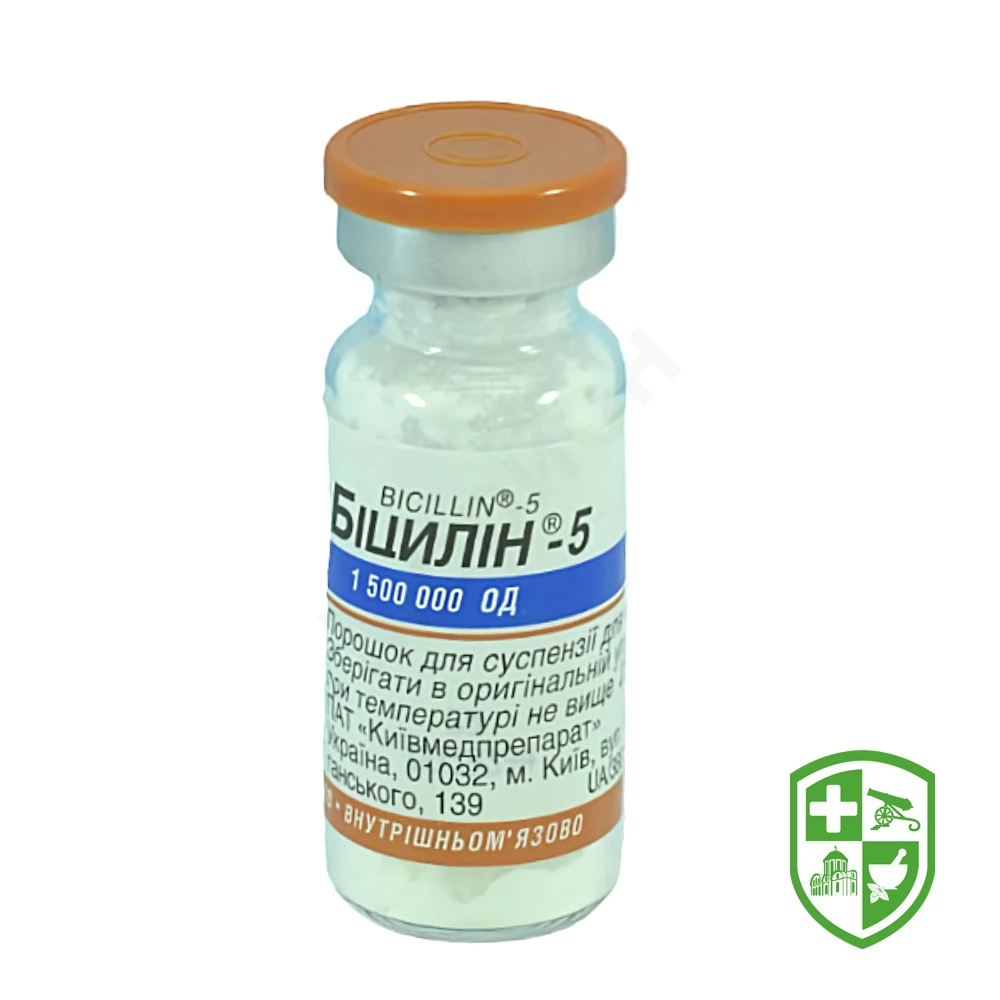 1 флакон містить: біцилін-5, порошок 1500000 ОД (суміш бензатину бензилпеніциліну стерильного (біцилін-1) — 1200000 ОД, бензилпеніциліну новокаїнової солі стерильної — 300000 ОД).