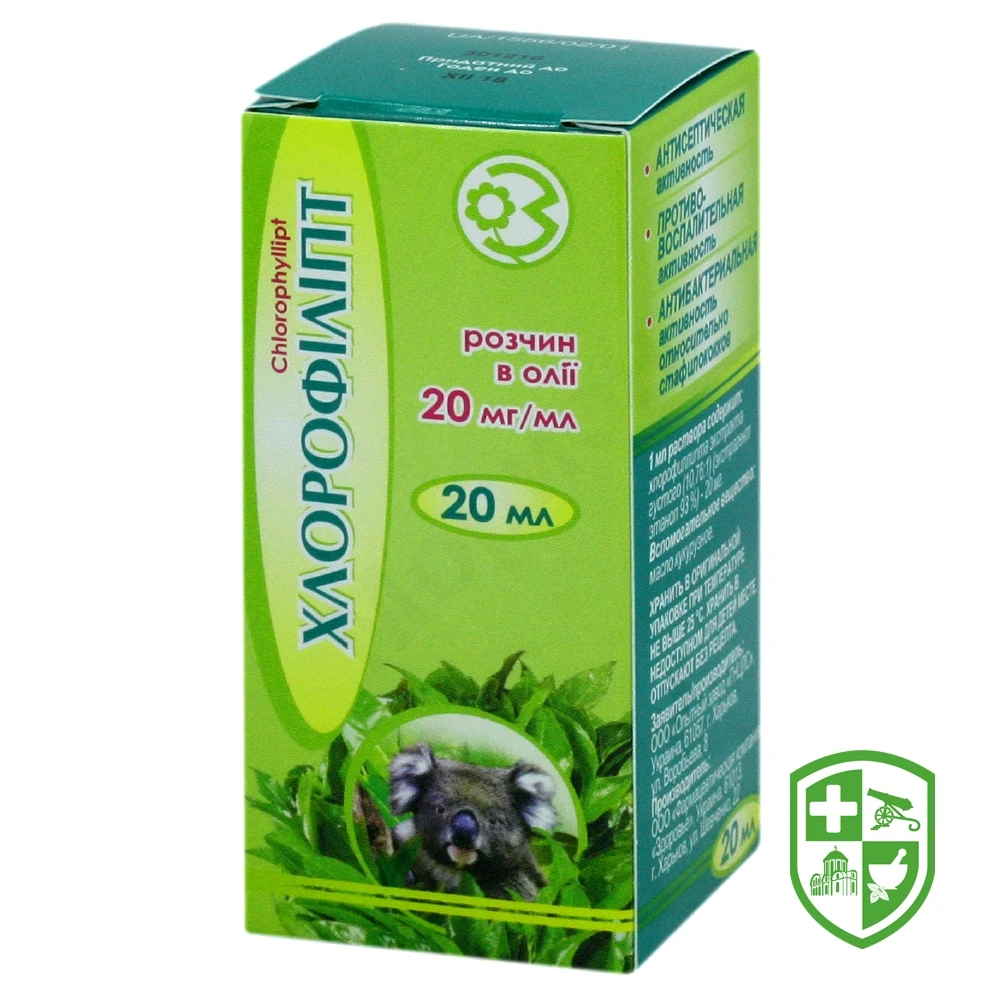діюча речовина: 1 мл розчину містить хлорофіліпту екстракту густого (10,76:1) (екстрагент етанол 93%) — 20 мг;