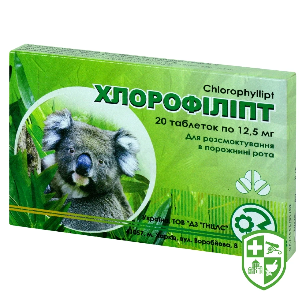діюча речовина: 1 таблетка містить хлорофіліпту екстракту густого (10,76:1) (екстрагент етанол 93%) — 12,5 мг або 25 мг;