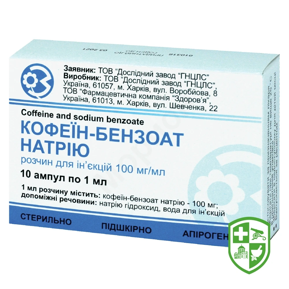 1 мл розчину містить кофеїн-бензоату натрію 100 мг або 200 мг;