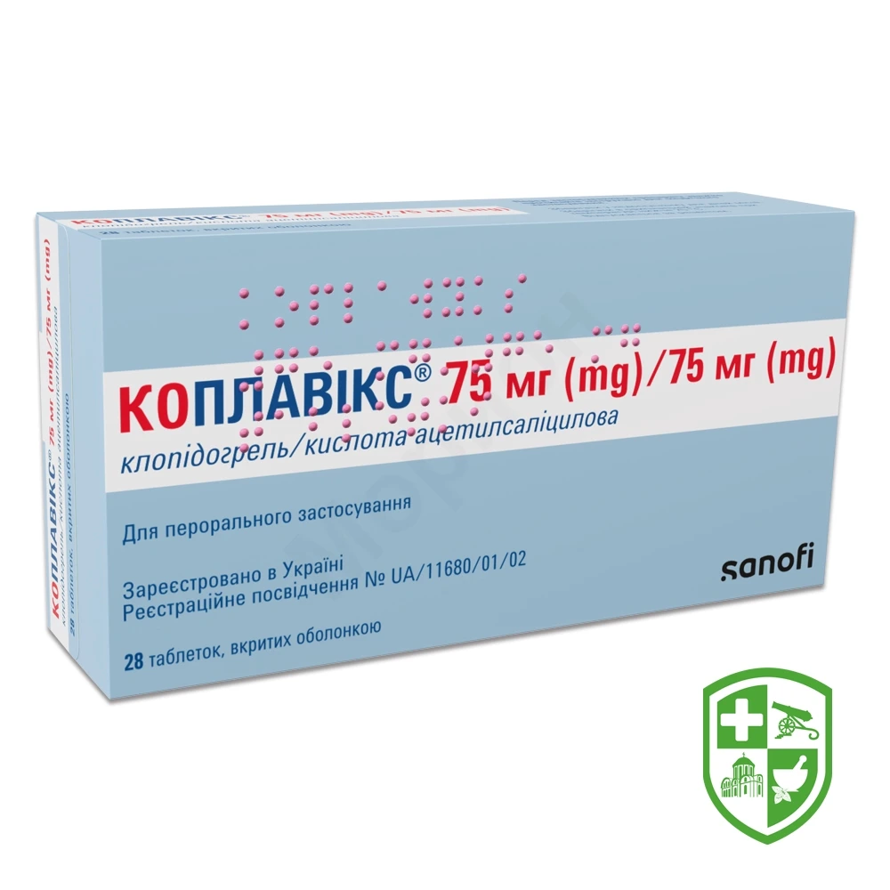 Метаболізм та виведення. АСК, що входить до складу препарату Коплавікс®, швидко перетворюється шляхом гідролізу в саліцилову кислоту, період напіввиведення якої у разі доз АСК 75–100 мг становить 0,3–0,4 години. Саліцилова кислота здебільшого кон’югує в печінці, де утворюється саліцилуринова кислота, феноловий глюкуронід, ациловий глюкуронід, ряд вторинних метаболітів. Період плазмового напіввиведення саліцилової кислоти в препараті Коплавікс® становить приблизно 2 години. Метаболізм саліцилатів є насиченим, загальний кліренс організму знижується у разі високих сироваткових концентрацій через обмежену здатність печінки утворювати як саліцилуринову кислоту, так і феноловий глюкуронід. У разі застосування токсичних доз (10–20 г) період напіввиведення з плазми може перевищувати 20 годин. У разі застосування високих доз АСК виведення саліцилової кислоти підпорядковується кінетиці нульового порядку (тобто швидкість виведення є постійною відносно концентрації в плазмі крові), при цьому фактичний період напіввиведення становить 6 годин і більше. Ниркова екскреція незміненої активної речовини залежить від рН сечі. Оскільки значення рН сечі перевищує 6,5, нирковий кліренс вільного саліцилату збільшується з 5 до 80%. Після прийому терапевтичних доз приблизно 10% спостерігається в сечі у формі саліцилової кислоти, 75% — у формі саліцилуринової кислоти, 10% — у формі фенолового та 5% — у формі ацилового глюкуроніду саліцилової кислоти.