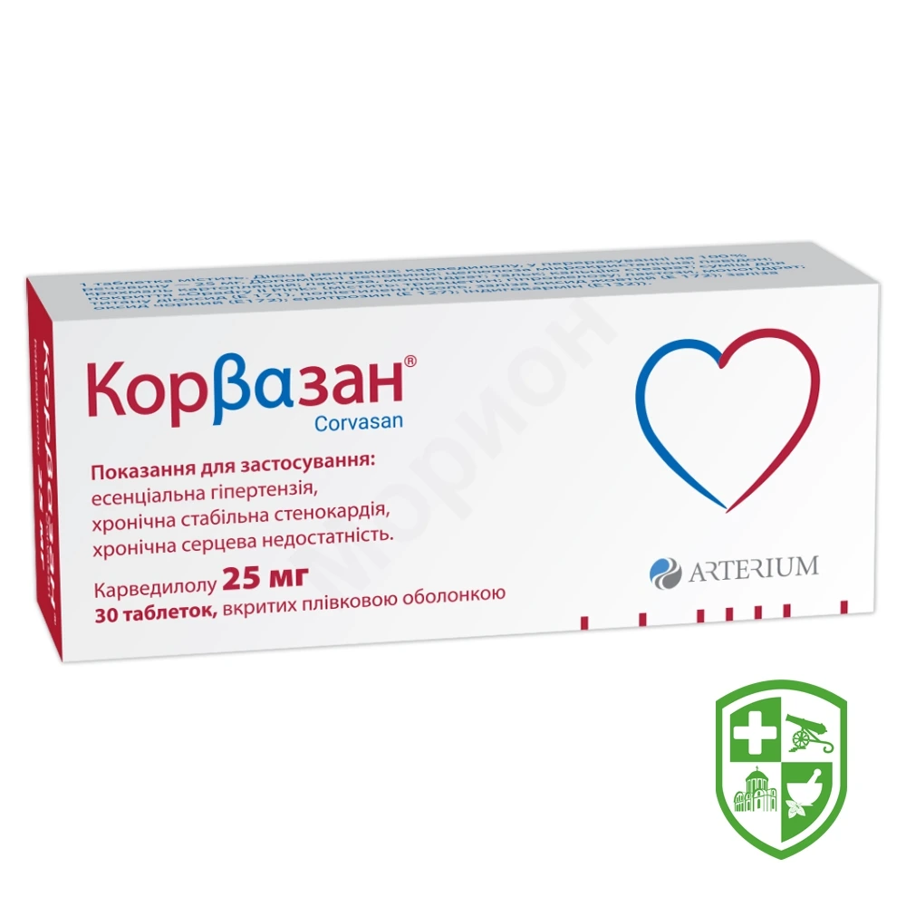 Деякі антиаритмічні, наркотичні, гіпотензивні засоби, препарати для лікування стенокардії, інші β-блокатори (наприклад, у вигляді очних крапель), препарати, що знижують рівень катехоламінів (наприклад, інгібітори моноаміноксидази, резерпін) і серцеві глікозиди можуть посилювати ефекти карведилолу. Тому дозу цих препаратів і препарату Корвазан® потрібно підбирати з обережністю.