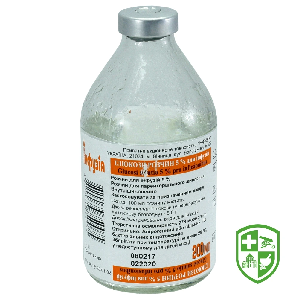 100 мл розчину містять глюкози (у перерахуванні на глюкозу безводну) 5 г;