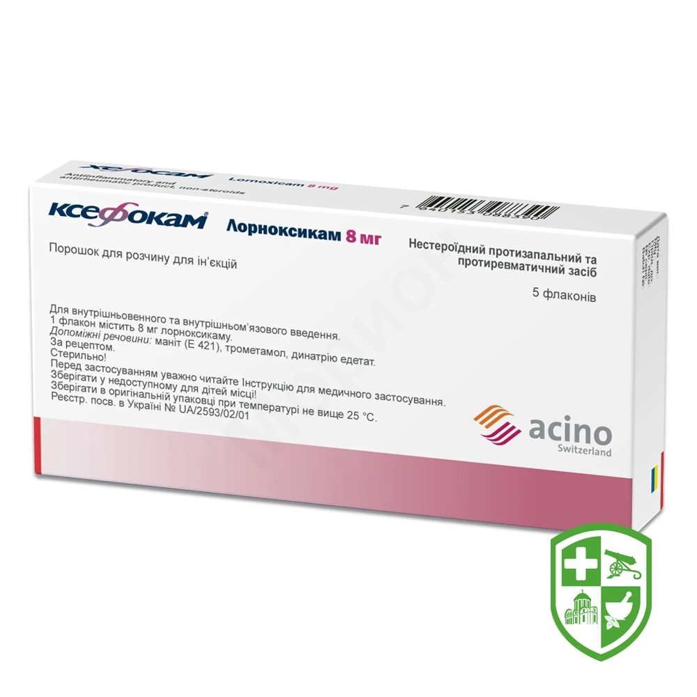 Гіперчутливість до лорноксикаму або до компонентів препарату; тромбоцитопенія; гіперчутливість (симптоми, подібні до таких при астмі, риніті, ангіоневротичному набряку або кропив’янці) до інших НПЗЗ, включаючи ацетилсаліцилову кислоту; тяжка форма серцевої недостатності; шлунково-кишкові кровотечі, цереброваскулярні або інші кровотечі; шлунково-кишкова кровотеча або перфорація в анамнезі, що пов’язані з попередньою терапією НПЗЗ; активна рецидивуюча пептична виразка шлунка/ кровотеча або рецидивуюча пептична виразка шлунка/ кровотеча в анамнезі (два або більше окремих епізоди доведеного розвитку виразки або кровотечі); тяжка форма печінкової недостатності; тяжка форма ниркової недостатності (рівень сироваткового креатиніну >700 мкмоль/л); III триместр вагітності (дивись розділ «Застосування у період вагітності або годування груддю»).Особливі заходи безпеки. Розчин для ін’єкцій готується безпосередньо перед застосуванням (вміст 1 флакона (8 мг ліофілізату) розчиняється водою для ін’єкцій (2 мл)). Зовнішній вигляд препарату після відновлення — прозорий розчин жовтого кольору, вільний від видимих часток.