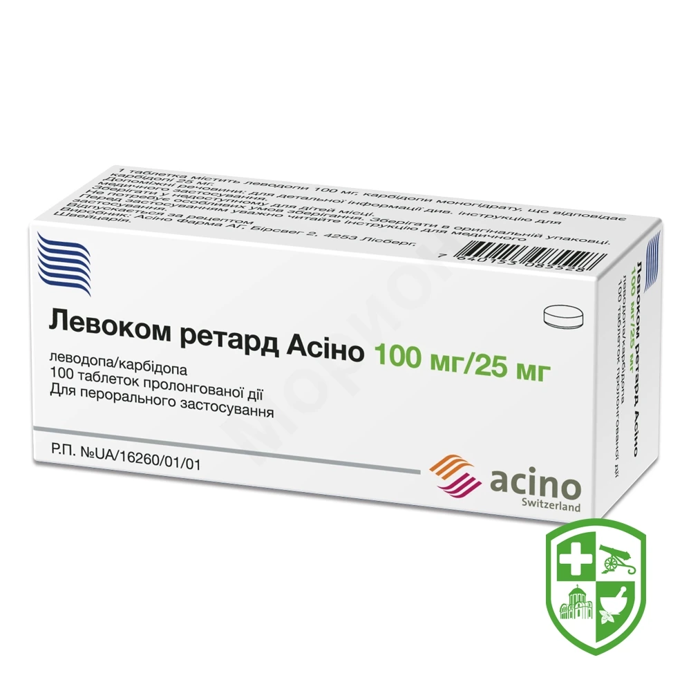 1 таблетка пролонгованої дії препарату Левоком ретард Асіно 100/25 містить: леводопи 100 мг, карбідопи моногідрату, що відповідає карбідопі, — 25 мг;