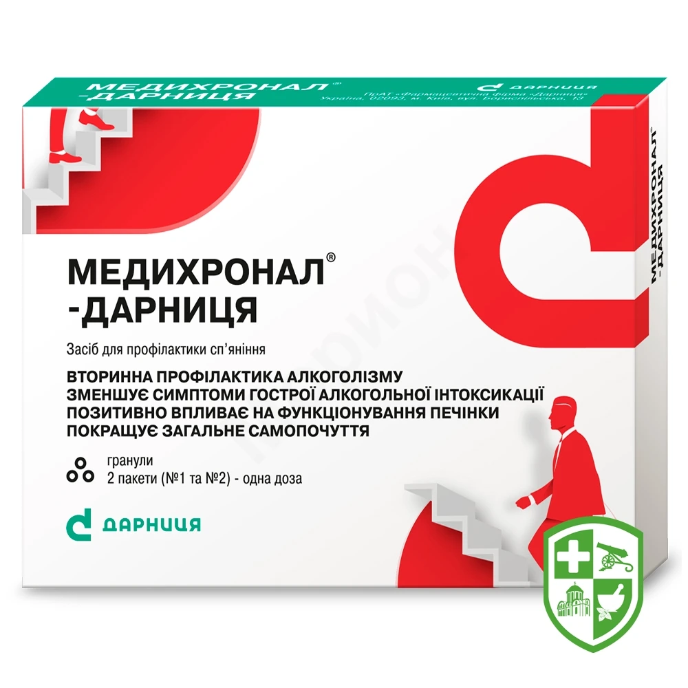 Лікарський засіб Медихронал®-Дарниця є комбінованим засобом, який сприяє зниженню накопичування в організмі токсичних метаболітів алкоголю, зокрема оцтового альдегіду (продукту окиснення етанолу).