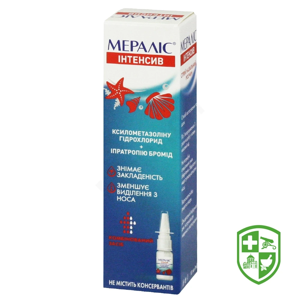 Кількість лікарського засобу Мераліс® Інтенсив при 1 впорскуванні (приблизно 140 мкл) містить приблизно 70 мкг ксилометазоліну гідрохлориду та 84 мкг іпратропію броміду.