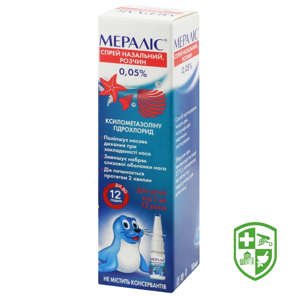 Мераліс®, 0,05% спрей назальний, призначати дітям віком від 2 до 12 років по 1 впорскуванню у кожен носовий хід 1–2 рази на добу.