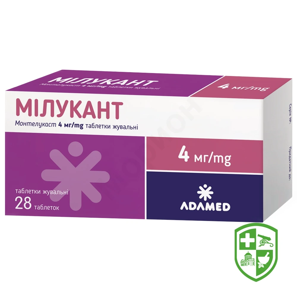 (4 мг) на добу, ввечері. Мілукант слід приймати за 1 годину до їди або через 2 години після їди. Немає необхідності в корекції дози для цієї вікової групи. Препарат Мілукант у лікарський формі таблетки жувальні (4 мг) не рекомендований для дітей віком до 2 років.