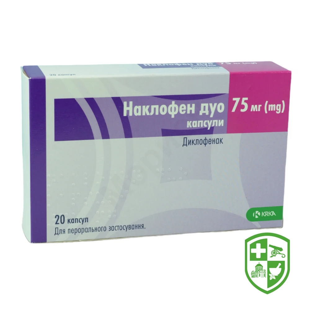 Гіперчутливість до диклофенаку або до інших компонентів препарату. Виразка шлунка та/або дванадцятипалої кишки в активній формі або рецидивуюча виразкова хвороба/кровотеча в анамнезі (два або більше окремих епізоди встановленої виразки або кровотечі); шлунково-кишкова кровотеча або перфорація тракту в анамнезі, пов'язані з попереднім лікуванням нестероїдними протизапальними препаратами (НПЗП). Тяжка ниркова (кліренс креатиніну 30 мл/хв) або печінкова недостатність (клас С за Чайлдом — П’ю, цироз або асцит). Запальні захворювання кишечнику (хвороба Крона або виразковий коліт). ІІІ триместр вагітності та годування груддю. Дітям віком до 18 років. Застійна серцева недостатність (NYHA ІІ-ІV). Ішемічна хвороба серця у пацієнтів, які мають стенокардію або перенесений інфаркт міокарда. Цереброваскулярні захворювання у пацієнтів, які перенесли інсульт або мають епізоди транзиторних ішемічних атак. Захворювання периферичних артерій. Неконтрольована артеріальна гіпертензія. Лікування периопераційного болю після аортокоронарного шунтування або використання апарату штучного кровообігу. Наклофен Дуо, подібно до інших НПЗЗ, протипоказаний пацієнтам, у яких напади бронхіальної астми, ангіоедема, кропив’янка або гострий риніт, поліпи носа та інші алергічні симптоми провокуються прийомом ібупрофену, ацетилсаліцилової кислоти або інших препаратів, які мають здатність інгібувати простогландин-синтетазу.Взаємодія з іншими лікарськими засобами та інші види взаємодій
