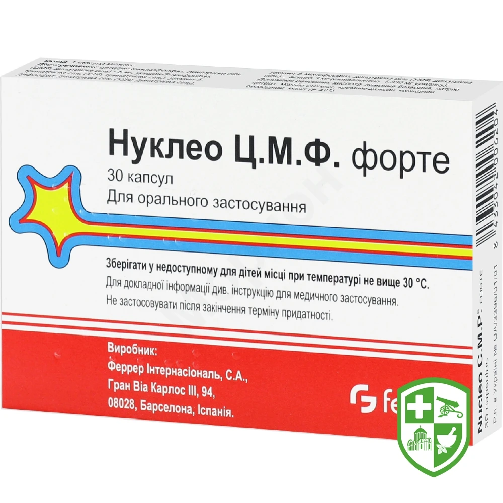 Нуклео Ц.М.Ф. Форте у своєму складі містить нуклеотиди: цитидину монофосфат (ЦМФ), уридину трифосфат (УТФ), − які широко використовуються для лікування захворювань центральної нервової системи (ЦНС).