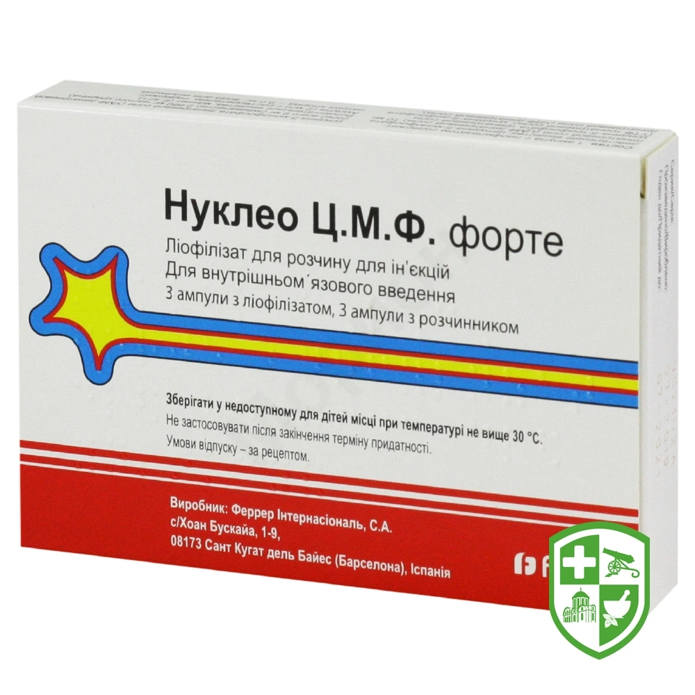 Нуклео Ц.М.Ф. Форте у своєму складі містить нуклеотиди: цитидину монофосфат (ЦМФ), уридину трифосфат (УТФ), − які широко використовуються для лікування захворювань центральної нервової системи (ЦНС).