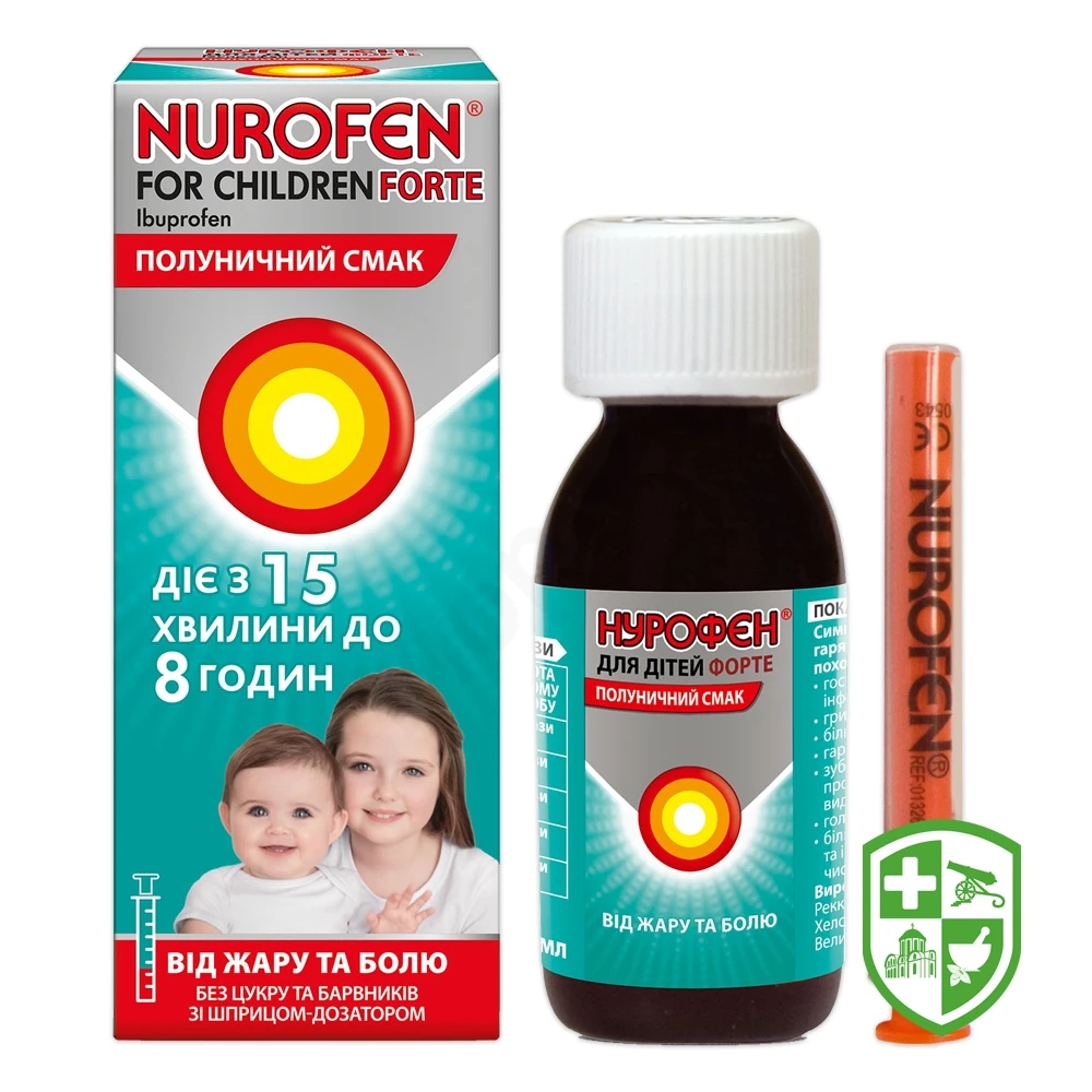 Анальгезуюча доза для дітей становить від 7 до 10 мг/кг маси при максимальному застосуванні 30 мг/кг/добу. Нурофєн® для дітей форте містить ібупрофен, який продемонстрував у відкритому дослідженні початок жарознижувальної дії через 15 хвилин після його застосування і зниження температури у дітей протягом періоду до 8 годин.