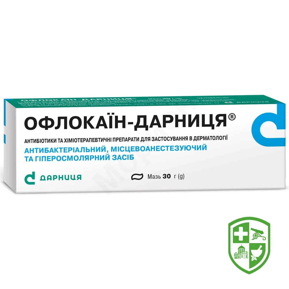 Офлокаїн-Дарниця® є комбінацією протимікробного засобу групи фторхінолонів офлоксацину та місцевого анестетика — лідокаїну — на гідрофільній, гіперосмолярній і водорозчинній основі. Фармакологічні ефекти мазі зумовлені властивостями діючих речовин, які входять до її складу.