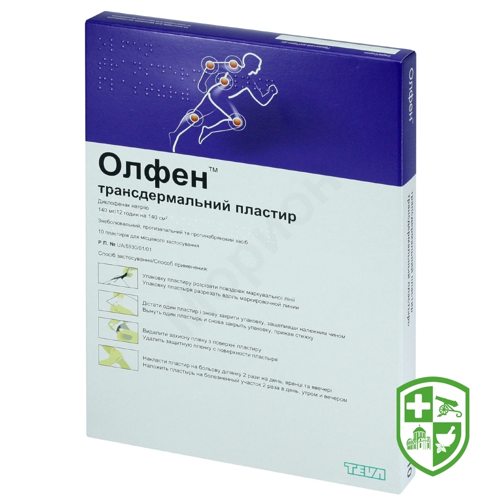 Олфен®, пластир лікувальний, є нестероїдним протизапальним препаратом (НПЗП) із болезаспокійливими властивостями, призначений для місцевого застосування. Терапевтична дія обумовлена інгібуючим впливом диклофенаку натрію на синтез простагландинів.
