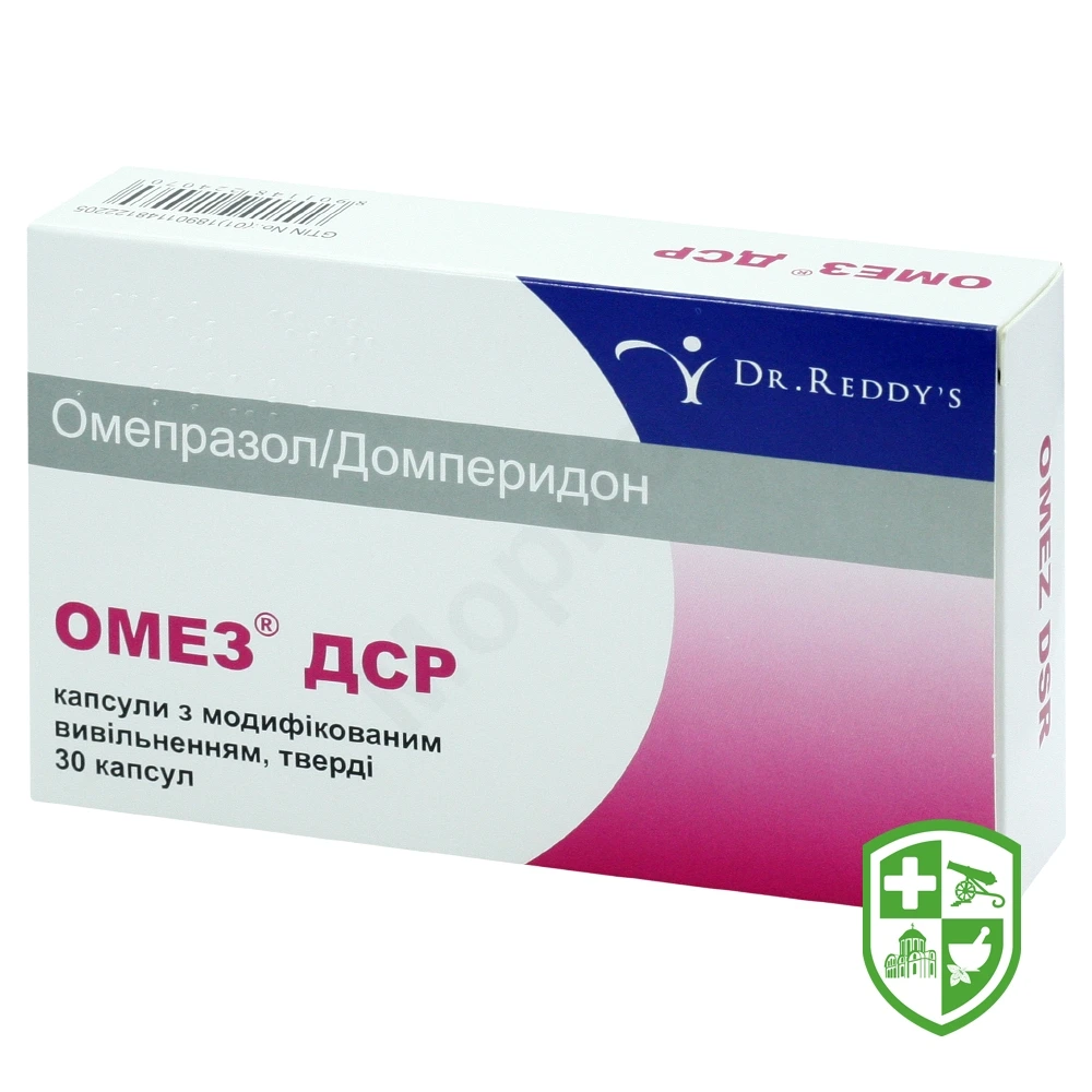 та «DR. REDDY’S» на кришечці капсули і маркуванням червоного кольору «OMEZ-DSR» на корпусі капсули. Вміст капсул — пелети сферичної форми від майже білого до сіруватого та від жовтувато-коричневого до коричневого кольору.