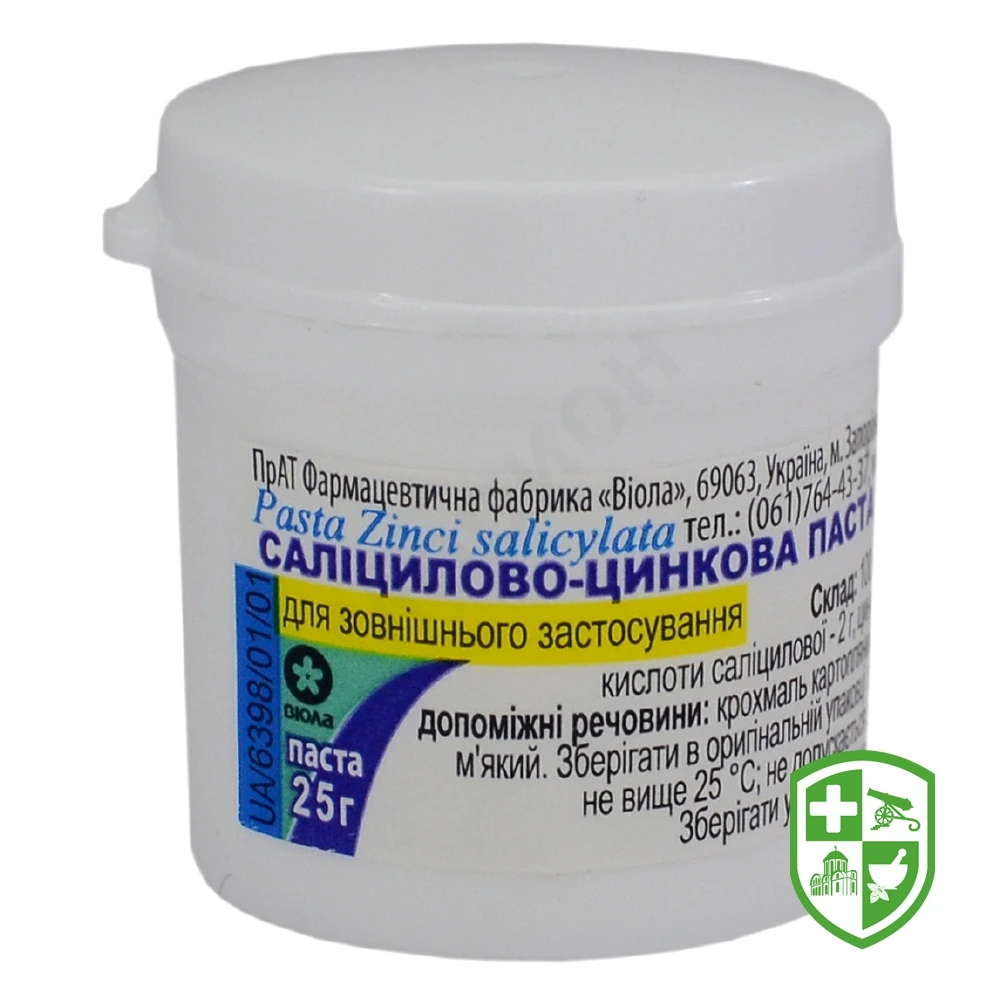 100 г пасти містять саліцилової кислоти — 2 г, цинку оксиду — 25 г;