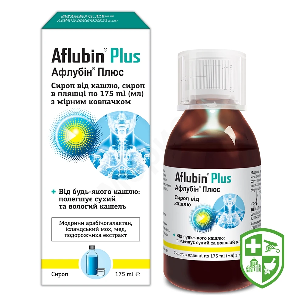 завдяки унікальному комплексу полісахаридів, що міститься в рослинних екстрактах, засіб Афлубін® Плюс сироп від кашлю здатний заспокоїти кашель, полегшити подразнення та сприяє відходженню надлишку мокротиння. Афлубін® Плюс сироп від кашлю заспокоює сухий та продуктивний кашель, він також корисний в якості ад’юванта для захисту дихальних шляхів, оскільки створює мукоадгезивний бар’єр, здатний обмежувати контакт з подразниками і патогенними мікроорганізмами. Механізм дії. Біль у горлі, кашель та інші гострі захворювання верхніх і нижніх дихальних шляхів дуже поширені, часто викликані патогенними мікроорганізмами або впливом шкідливих подразників, у тому числі з навколишнього середовища, та низькими температурами.Афлубін® Плюс сироп від кашлю містить рослинні екстракти для захисту слизової оболонки, полегшення кашлю та діє як відхаркувальний засіб. Полісахариди, що містяться у рослинних екстрактах засобу Афлубін® Плюс сироп від кашлю, утворюють мукоадгезивний гель, що сприяє захисту та створює бар’єр, здатний обмежувати контакт із зовнішніми подразниками і патогенними мікроорганізмами. Через їх подібність до води полісахариди сприяють зволоженню слизової оболонки та розрідженню слизу. Крім того, заспокійливі екстракти полегшують сухий і продуктивний кашель.Сироп містить мед, який надає йому приємний смак.