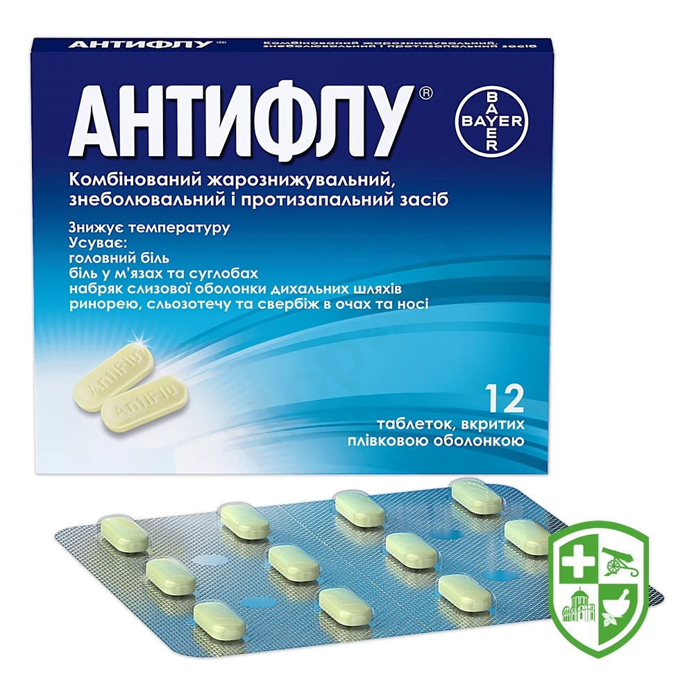 Основні фізико-хімічні властивості: таблетка у формі капсули, жовтого кольору, з прозорим плівковим покриттям та викарбуваним позначенням «AntiFlu» з одного боку.