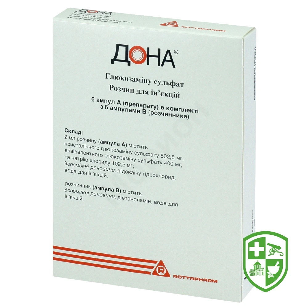 діюча речовина: 2 мл розчину (ампула А) містить кристалічного глюкозаміну сульфату 502,5 мг, еквівалентного глюкозаміну сульфату 400 мг, та натрію хлориду 102,5 мг;