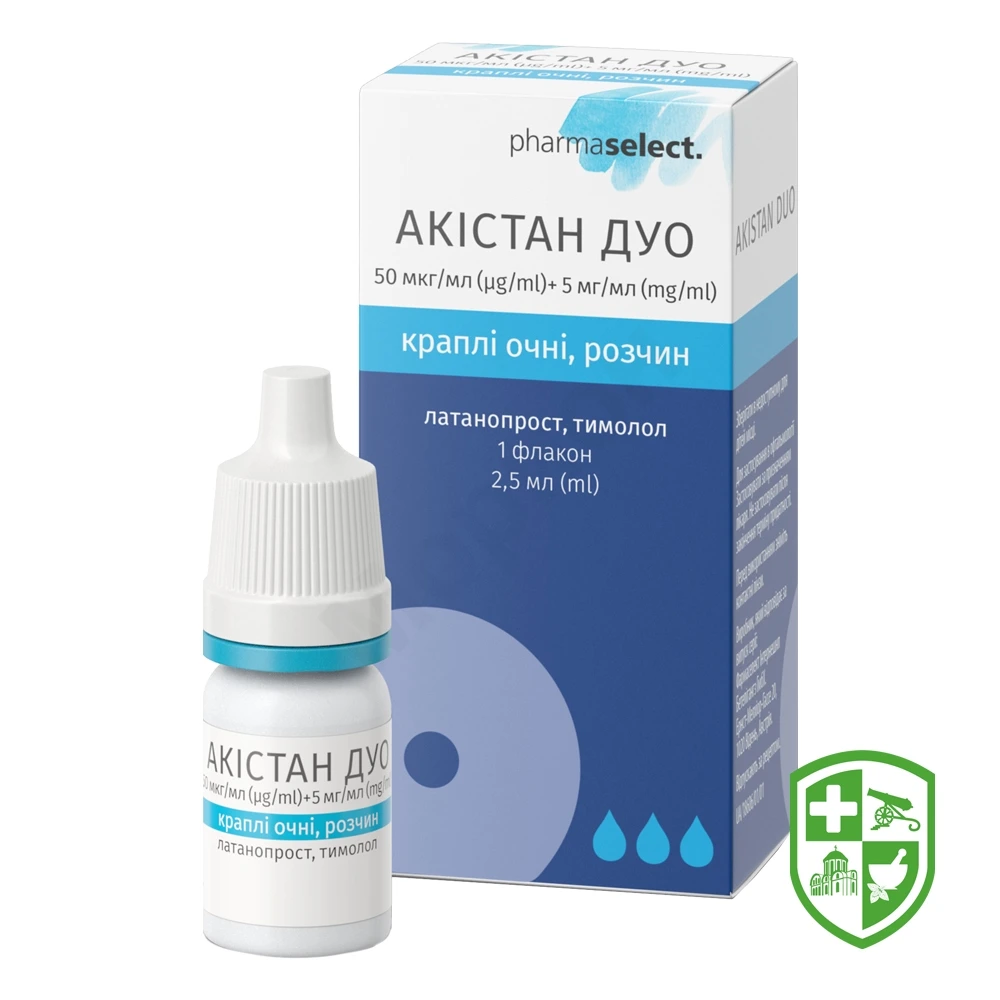 Акістан Дуо. Фармакологічних взаємодій між латанопростом та тимололом не спостерігалося, незважаючи на підвищення концентрації кислоти латанопросту у водянистій волозі майже у 2 рази після застосування комбінованого препарату порівняно з монотерапією.