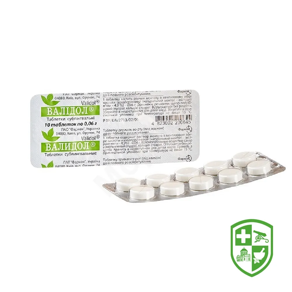 діюча речовина: 1 таблетка містить розчин ментолу в ментиловому ефірі кислоти ізовалеріанової (натуральний ментол — екстракт м’яти — 4,9%) — 0,06 г (60 мг);