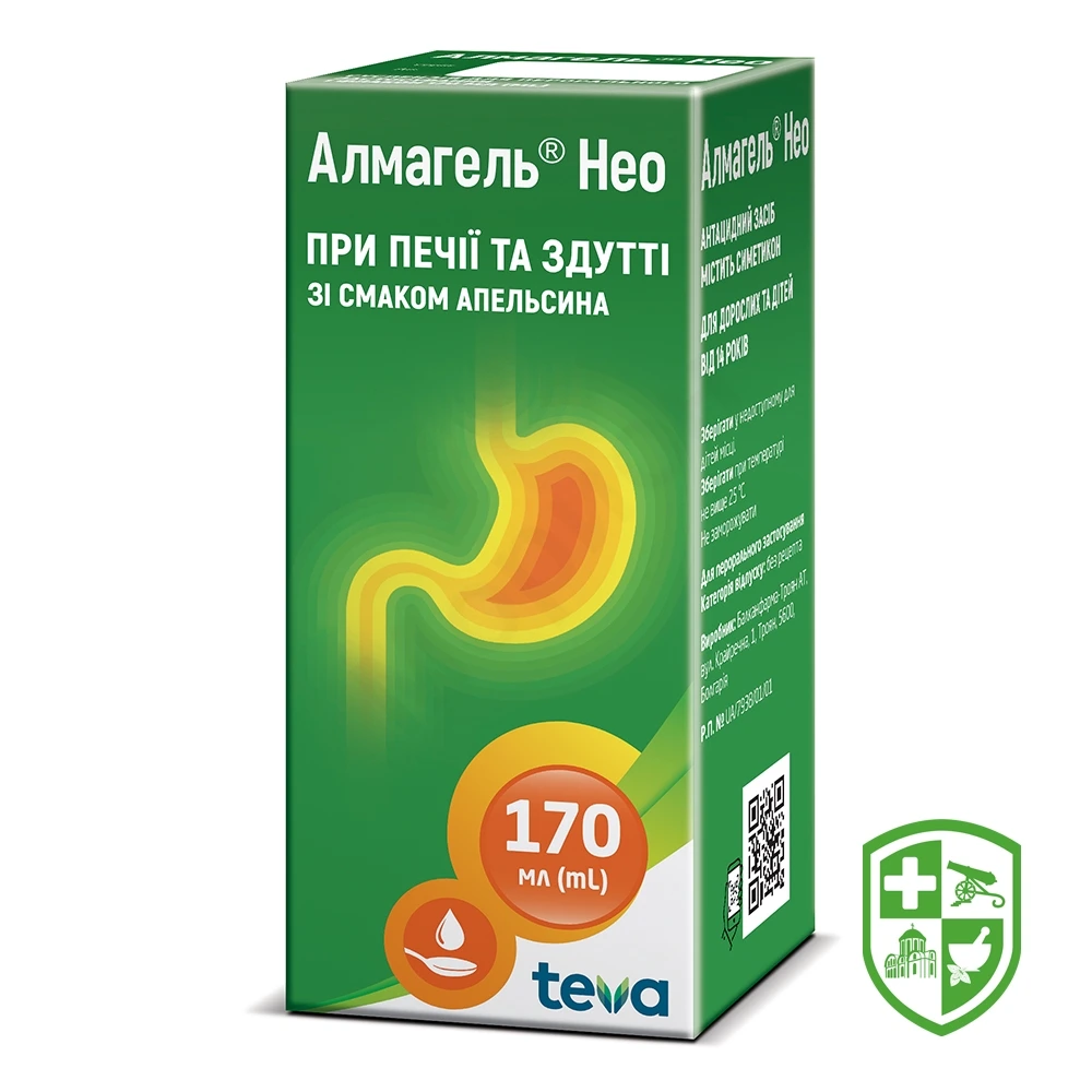 Алмагель® Нео — збалансована комбінація алюмінію гідроксиду та магнію гідроксиду з вітрогінним компонентом — симетиконом. Чинить тривалу антацидну дію, виявляє м'який проносний ефект, успішно усуває запори та знижує метеоризм у хворих із виразкою шлунка.
