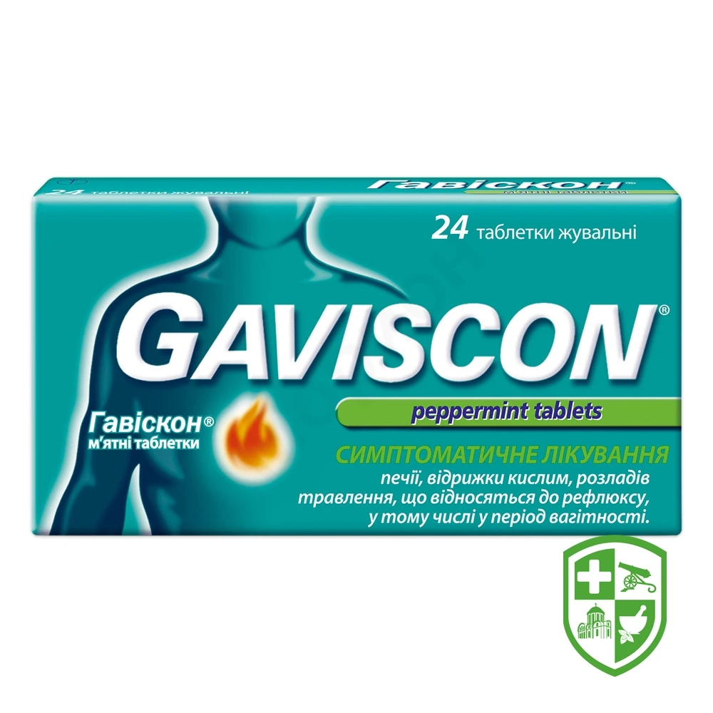 Після прийому внутрішньо Гавіскон® м’ятні таблеки швидко починають взаємодіяти зі шлунковим соком, утворюючи шар гелю альгінової кислоти на його поверхні, який має близьке до нейтрального значення рН та ефективно покриває стінки шлунка, запобігаючи появі гастроезофагеального рефлюксу. У тяжких випадках цей шар, розподілений по поверхні вмісту шлунка, піднімається до стравоходу та запобігає його подразненню.