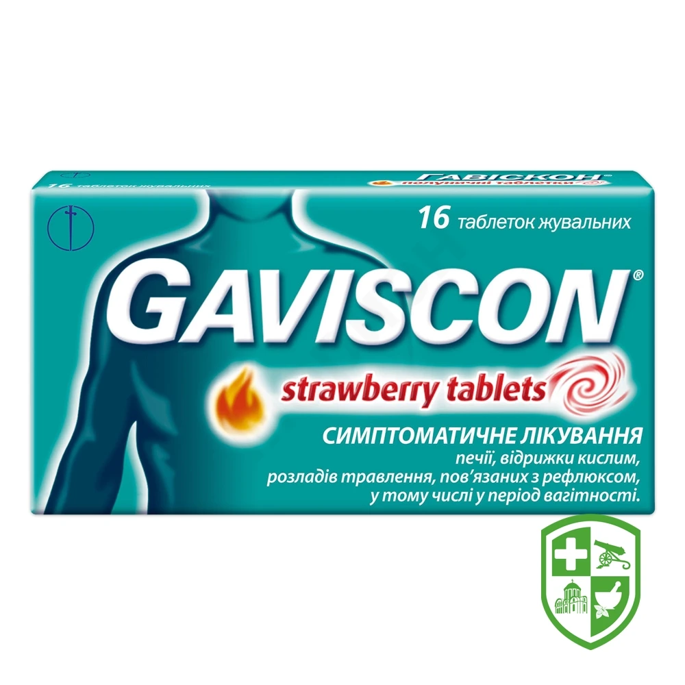 Після прийому внутрішньо лікарський засіб Гавіскон® полуничні таблетки швидко починає взаємодіяти зі шлунковим соком, утворюючи шар гелю альгінової кислоти на його поверхні, який має близьке до нейтрального значення рН та ефективно покриває стінки шлунка, запобігаючи появі гастроезофагеального рефлюксу протягом 4 годин. При гастроезофагеальному рефлюксі цей шар, розподілений по поверхні вмісту шлунка, піднімаючись до стравоходу, запобігає його подразненню.