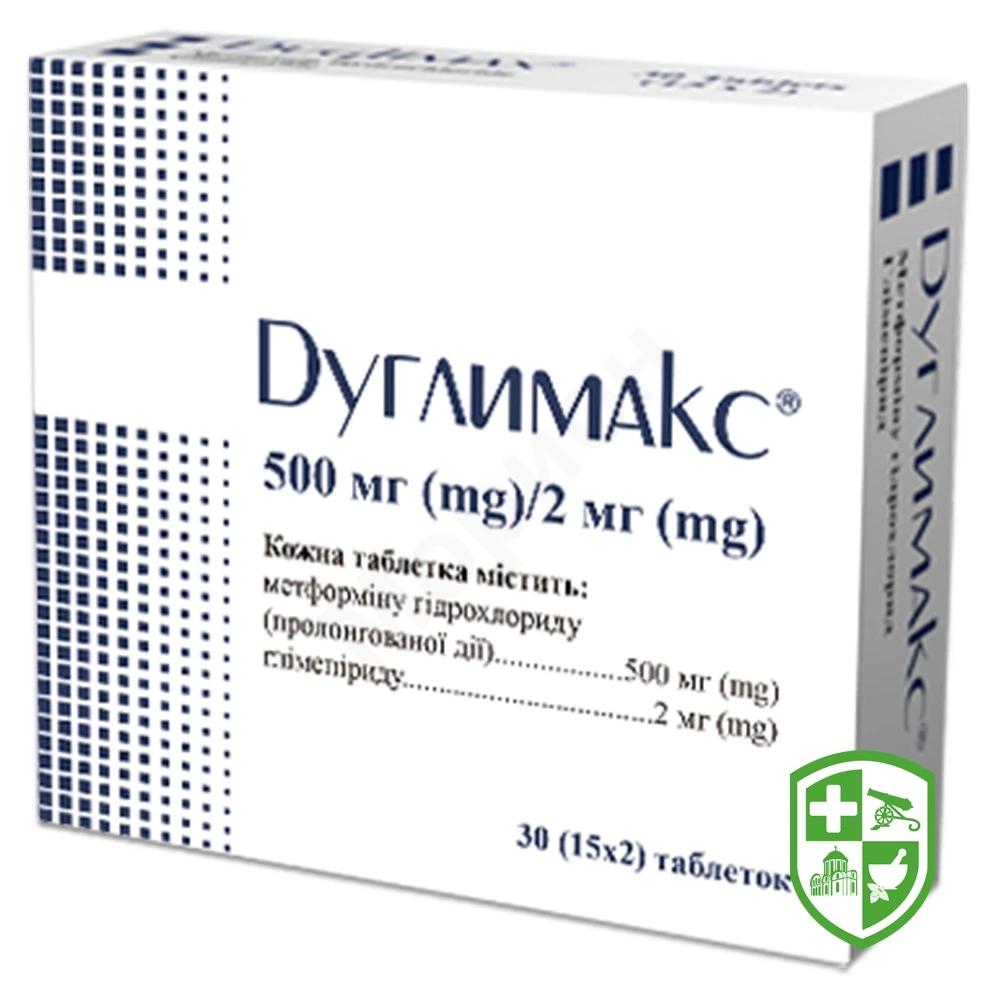 Інсулінозалежний цукровий діабет І типу (наприклад, цукровий діабет з кетонемією в анамнезі), діабетична кетонемія, діабетична кома та прекома, гострий або хронічний метаболічний ацидоз. Гіперчутливість до будь-якої з допоміжних речовин, що входять до складу цього препарату, або сульфонілсечовини, сульфаніламідів або бігуанідів. Печінкова недостатність, тяжкі порушення функції печінки, перебування на гемодіалізі (поки що немає досвіду застосування препарату у таких випадках). У разі тяжких розладів функції печінки та нирок для досягнення належного контролю над рівнем цукру в крові пацієнта необхідно перевести на інсулін. Вагітність; вірогідна вагітність; період годування груддю. Cхильніcть до розвитку лактоацидозу, випадки лактоацидозу в анамнезі, ниркова недостатність або порушення ниркової функції (про що свідчить, наприклад, показник креатиніну у плазмі крові ≥ 1,5 мг/дл у чоловіків та ≥ 1,4 мг/дл у жінок або порушення кліренсу креатиніну), що також може бути спричинено такими станами як серцево-судинний колапс (шок), гострий інфаркт міокарда та септицемія. Рентгенологічні дослідження із внутрішньосудинним введенням контрастних засобів, що містять йод (такі як внутрішньовенна урографія, внутрішньовенна холангіографія, ангіографія та комп’ютерна томографія (КТ)): йодовмісні контрастні засоби, призначені для внутрішньовенного введення під час проведення обстежень, можуть спричинити гостре порушення функції нирок та молочнокислий ацидоз у пацієнтів, які приймають метформін. Тому пацієнти, для яких плануються такі дослідження, повинні тимчасово припинити застосування препарату Дуглимакс® за 48 годин до проведення процедури. При цьому лікування не слід відновлювати доти, доки не буде здійснено повторної оцінки функції нирок і не встановлено, що вона є нормальною. Крім цього, препарат протипоказаний пацієнтам, які мають гострі симптоми, що можуть обумовлювати порушення функції нирок (дегідратація, тяжка інфекція, шок). Тяжкі інфекції, стани до та після хірургічних втручань, серйозна травма. При проведенні будь-якого хірургічного втручання необхідно тимчасово відкласти лікування цим препаратом (за винятком невеликих процедур, що не вимагають обмежень у прийомі їжі та рідини). Терапію не можна поновлювати доти, доки пацієнт не почне самостійно приймати їжу, а показники ниркової функції не будуть у межах норми. Недоїдання, голодування або виснаження пацієнта. Гіпофункція гіпофіза чи надниркових залоз. Порушення функції печінки (оскільки спостерігалися випадки виникнення лактоацидозу при порушенні функції печінки, цей препарат, як правило, не слід призначати пацієнтам з клінічними або лабораторними ознаками захворювання печінки), інфаркт легенів, тяжке порушення легеневої функції та інші стани, які можуть супроводжуватися гіпоксемією (серцева або легенева недостатність, нещодавно перенесений інфаркт міокарда, шок), надмірне зловживання алкоголем, дегідратація, шлунково-кишкові розлади, у тому числі діарея і блювання. Тяжка недостатність нирок (швидкість клубочкової фільтрації (ШКФ) 30 мл/хв). Застійна серцева недостатність, що вимагає медикаментозного лікування; нещодавно перенесений інфаркт міокарда; тяжка серцево-судинна недостатність або порушення дихання.Взаємодія з іншими лікарськими засобами та інші 
