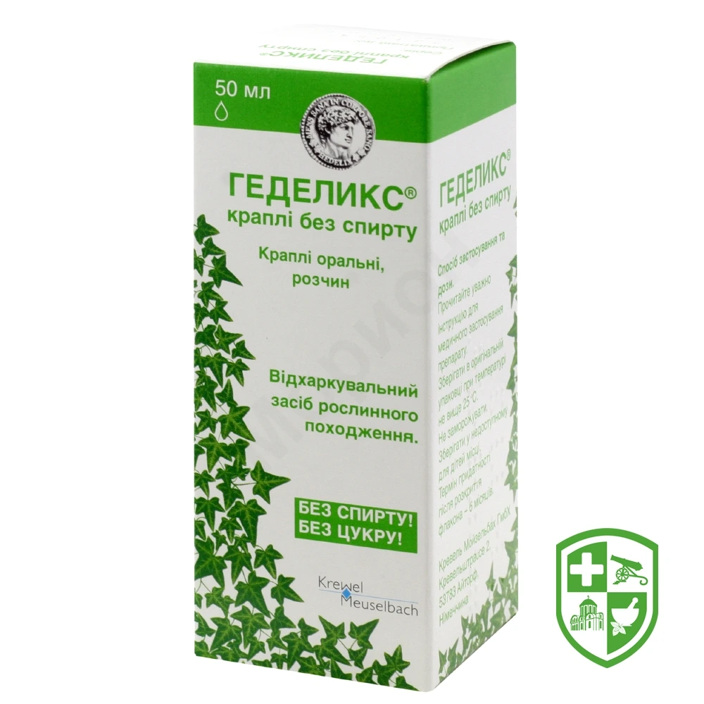 Геделикс® краплі без спирту — лікарський засіб рослинного походження, що містить активну речовину листя плюща екстракт густий, терапевтична дія якого при запальних захворюваннях дихальних шляхів ґрунтується на секретолітичній, муколітичній та спазмолітичній дії глікозидних сапонінів, що містяться у листі плюща.
