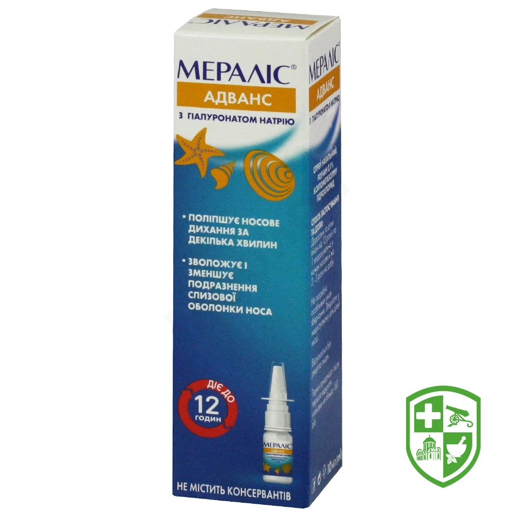 Препарат не знижує мукоциліарну функцію. Мераліс® Адванс має збалансоване значення рН у межах, властивих для носової порожнини. Гіалуронова кислота насичує слизову оболонку вологою і, таким чином, підтримує її в оптимальних умовах для процесу загоєння, якщо це потрібно.