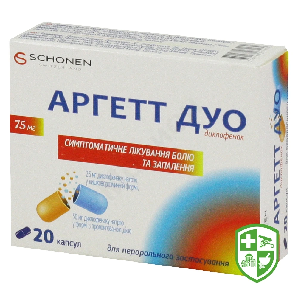 Препарат Аргетт Дуо містить диклофенак натрію, нестероїдну сполуку, що чинить виражену протизапальну, аналгетичну та жарознижувальну дію. Основним механізмом дії диклофенаку вважається гальмування біосинтезу простагландинів. Простагландини відіграють важливу роль у генезі запалення, болю і пропасниці.