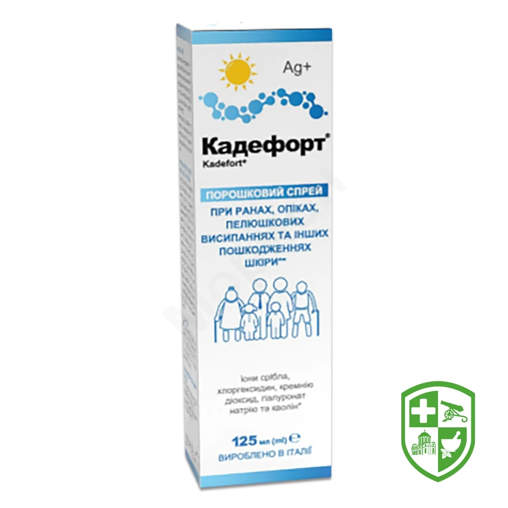 Спрей "Кадефорт" — рекомендований для використання з метою загоєння ран та комплексного захисту від зараження при опіках, подряпинах та інших пошкодженнях дерми, особливо при виділенні ексудату. Дія компонентів направлена на регенерацію тканин.