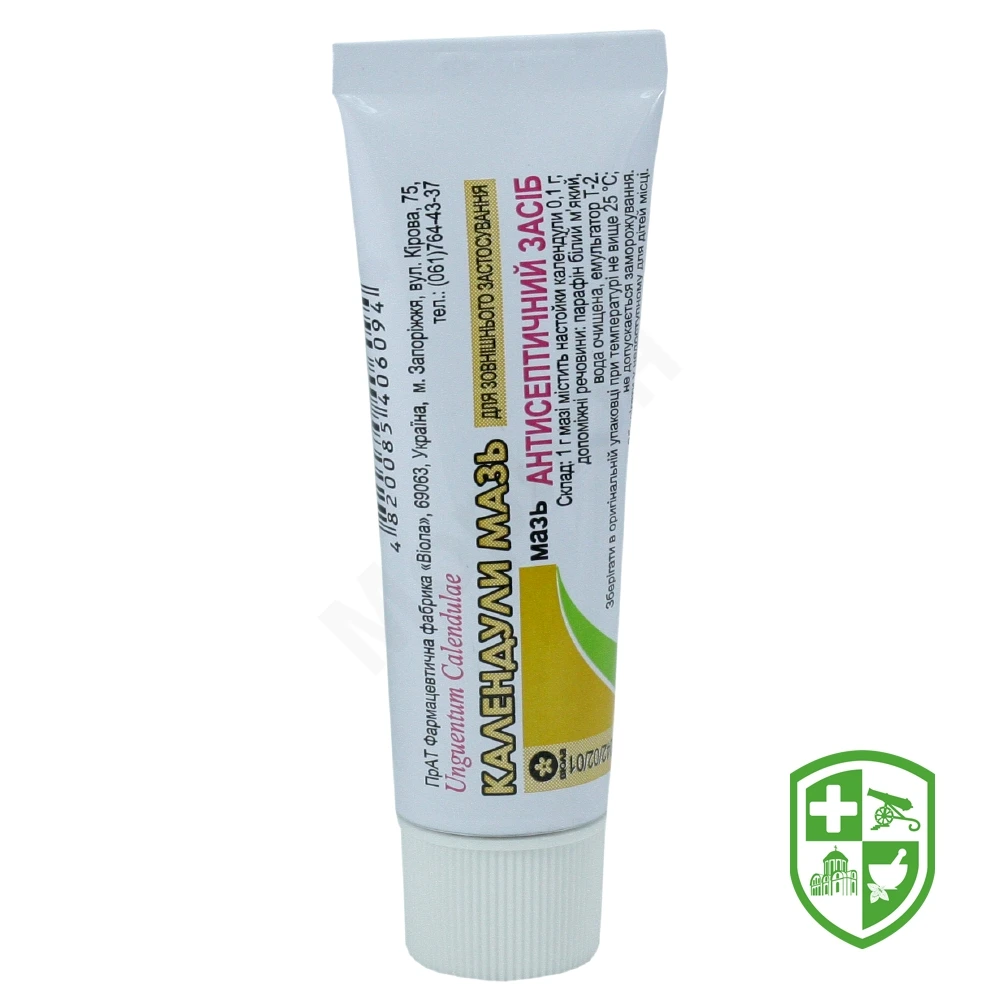 Календули мазь містить флавоноїди, каротиноїди, сапоніни, дубильні речовини, органічні кислоти та інші сполуки. Має антисептичні, протизапальні та репаративні властивості.