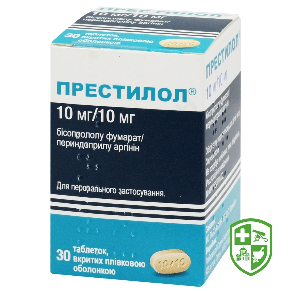 ПРЕСТИЛОЛ® 10 мг/10 мг: 1 таблетка містить 10 мг бісопрололу фумарату (що відповідає 8,49 мг бісопрололу) та 10 мг периндоприлу аргініну (що відповідає 6,790 мг периндоприлу);