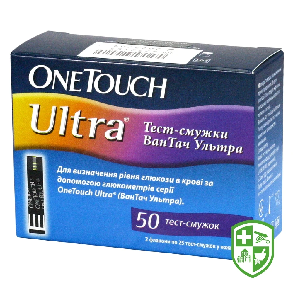 Тест-смужки OneTouch Ultra® (ВанТач Ультра) — 2 флакони по №25 тест-смужок в одній упаковці. Для самоконтролю глюкози в крові з глюкометрами OneTouch Ultra® (ВанТач Ультра) і OneTouch UltraEasy® (ВанТач Ультра Ізі).