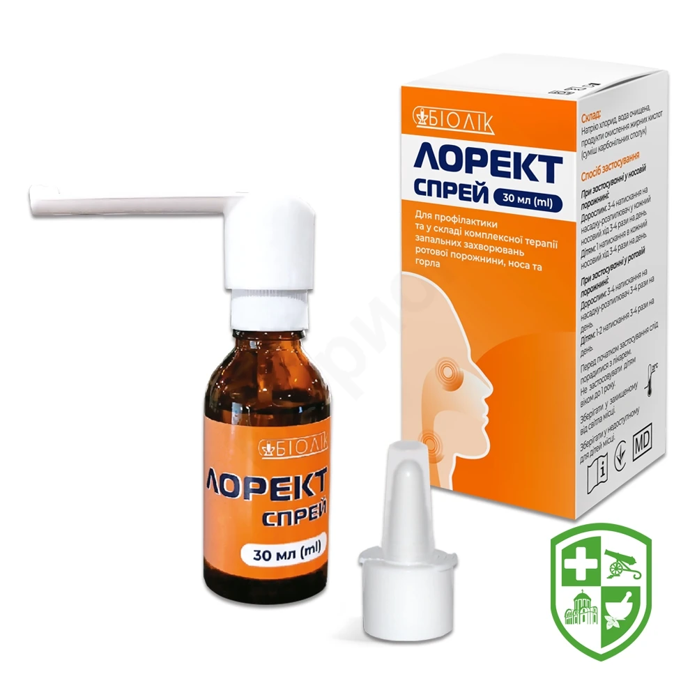 Лорект® спрей являє собою ефективний антисептичний гігієнічно-профілактичний засіб природного походження, отриманий шляхом окислення риб’ячого жиру за допомогою ізотонічного розчину натрію хлориду.Сировиною для отримання засобу є риб’ячий жир, виділений з органів і тканин морських тварин і який містить в своєму складі велику кількість омега-3, омега-6, омега-9 ненасичених жирних кислот, а також вітаміни D3, А, Е.При взаємодії риб’ячого жиру з ізотонічним водним розчином натрію хлориду в присутності кисню повітря і при нагріванні відбувається процес окислення компонентів риб’ячого жиру. В ході процесу окислення жирних кислот риб’ячого жиру утворюються карбонільні сполуки, що мають антимікробну активність відносно гноєрідної (піогенної) мікрофлори ‒ синьогнійної палички, протея, кишкової палички, стафілококів, а також щодо дріжджових грибів роду Candida. Така активність пов’язана з особливістю будови карбонільних сполук, що визначає їх здатність до інактивації багатьох ферментів мікробної клітини, що призводить до пригнічення життєво важливих метаболічних процесів в ній.В результаті процесу окислення натурального риб’ячого жиру природним шляхом без додавання хімічних реагентів і оксидантів отримано засіб гігієнічно-профілактичний Лорект® спрей, який є єдиним, що містить суму карбонільних сполук, достатню для прояву необхідної антимікробної та антисептичної активності. Наявність карбонільних сполук у присутності ізотонічного розчину натрію хлориду сприяє знищенню мікробів на слизовій оболонці носової та ротової порожнин, не порушуючи її нормальну мікрофлору; видаленню вірусів, бактерій і алергенів; зволоженню і очищенню слизової носа, видаляючи надлишковий слиз, скоринки і найдрібніші частинки після операцій без ризику кровотечі.В результаті покращується функція миготливого епітелію, підсилюється опірність слизової оболонки ротової порожнини, порожнини носа і придаткових пазух до проникнення хвороботворних бактерій і вірусів, нормалізуються реологічні властивості слизу.Запропонований засіб допомагає відновити прохідність і нормальне функціонування дихальних шляхів, прискорює одужання при захворюваннях носоглотки і придаткових пазух носа.Засіб являє собою прозору рідину жовтого кольору. В процесі зберігання допускається поява осаду світло-коричневого кольору, який легко розбивається при струшуванні.