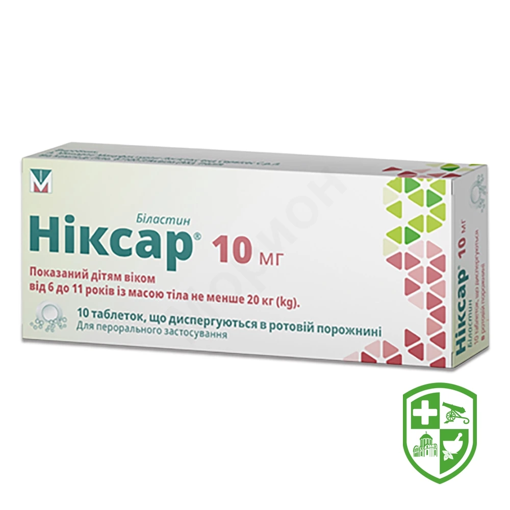 Симптоматичне лікування алергічного ринокон’юнктивіту (сезонного та цілорічного) і кропив’янки. Лікарський засіб Ніксар® 10 мг показаний дітям віком від 6 до 11 років із масою тіла не менше 20 кг.