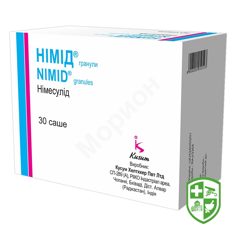 Порушення функції нирок. Враховуючи фармакокінетику, пацієнтам із легким або помірним порушенням функції нирок (кліренс креатиніну 30–80 мл/хв) корекція дози не потрібна, у той час як при тяжкому порушенні функції нирок (кліренс креатиніну 30 мл/хв) лікарський засіб Німід® протипоказаний (див. розділи «Протипоказання» і «Фармакокінетика»).
