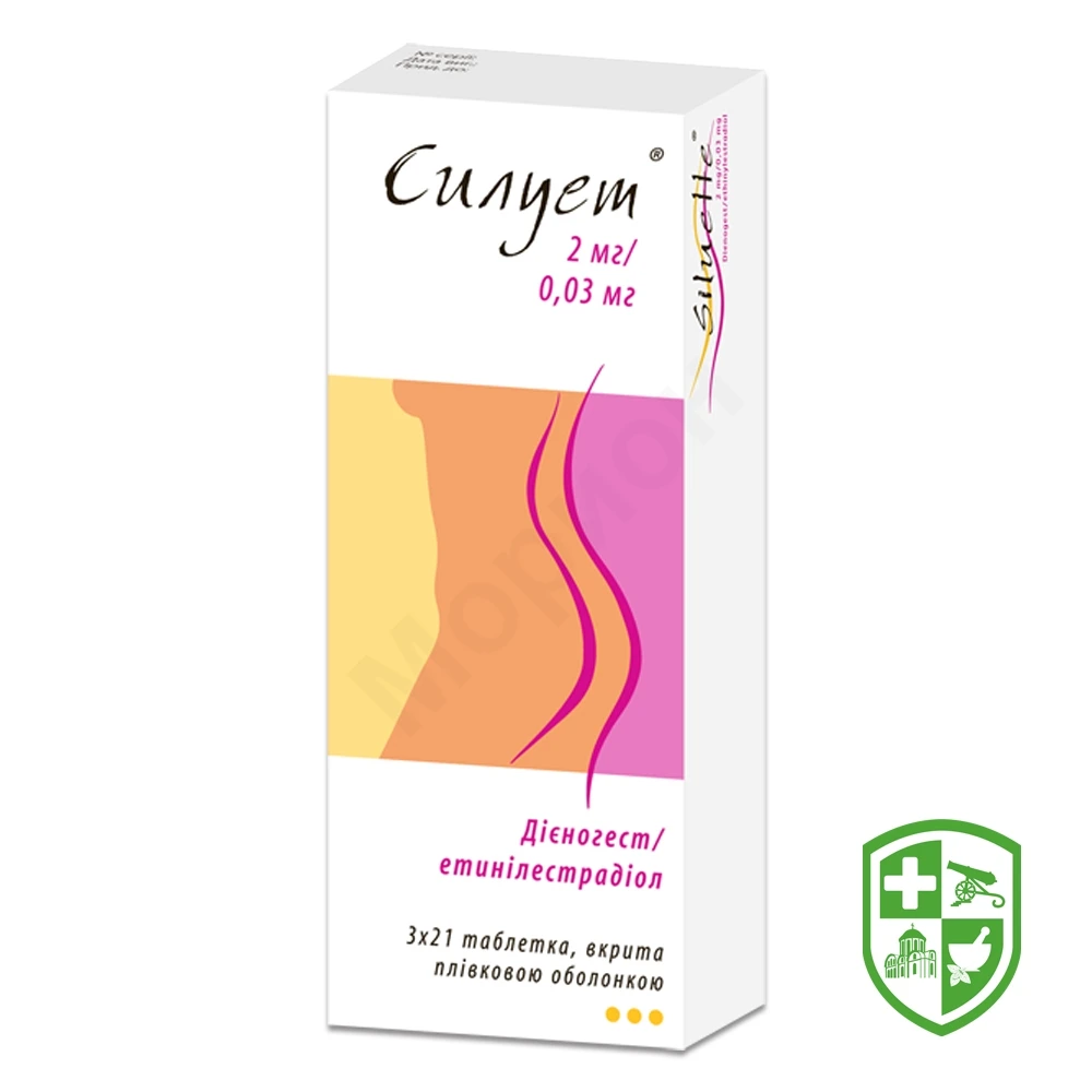 нескоригований індекс Перля — 0,454 (верхній 95% довірчий інтервал (ДІ): 0,701); скоригований індекс Перля — 0,182 (верхній 95% довірчий інтервал: 0,358).Силует®, таблетки, вкриті плівковою оболонкою, — це комбінований пероральний контрацептив (КПК) з антиандрогенним ефектом, який містить етинілестрадіол та дієногест як прогестерон.